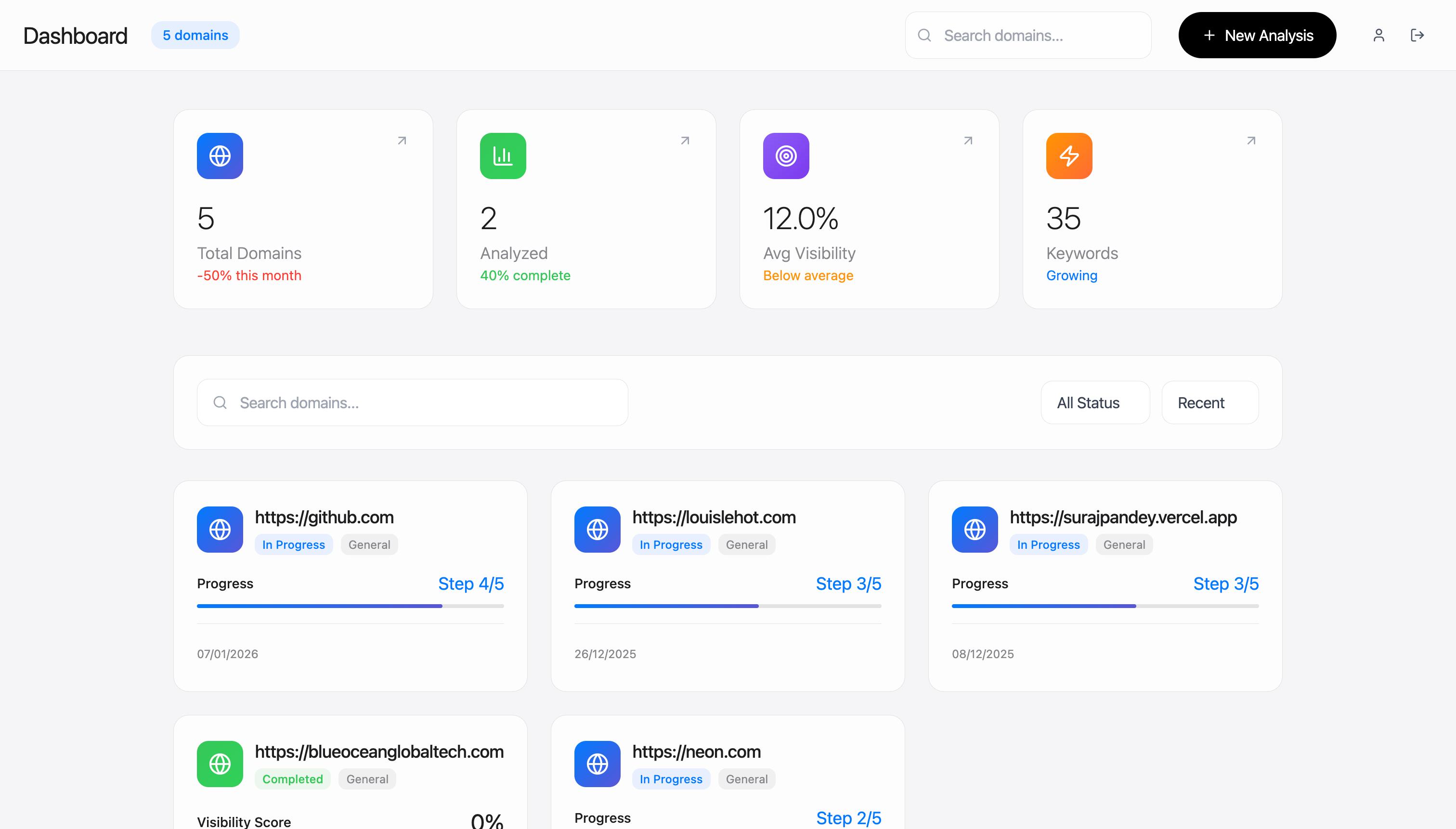 The platform’s core innovation lies in its automated AI-visibility workflow. Users enter a domain, after which the system scrapes the website, generates targeted prompts where AI models are expected to mention the brand, and runs those prompts across multiple leading AI models. Responses are analyzed in real time to evaluate brand presence, rankings, and competitor performance—without manual prompt testing or experimentation.